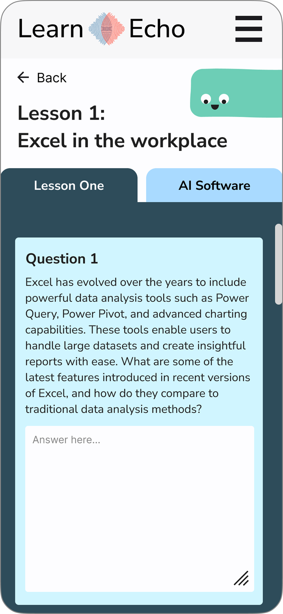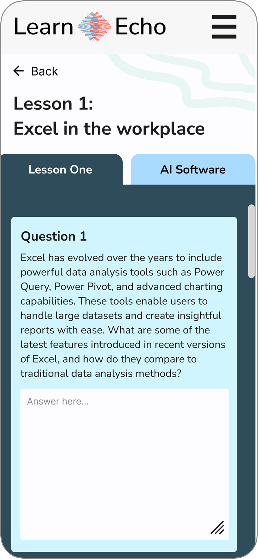 LearnEcho, a career-based skill learning platform that utilizes contemporary AI, reiterative learning, and responsive design to create flexible and comprehensive learning opportunities.