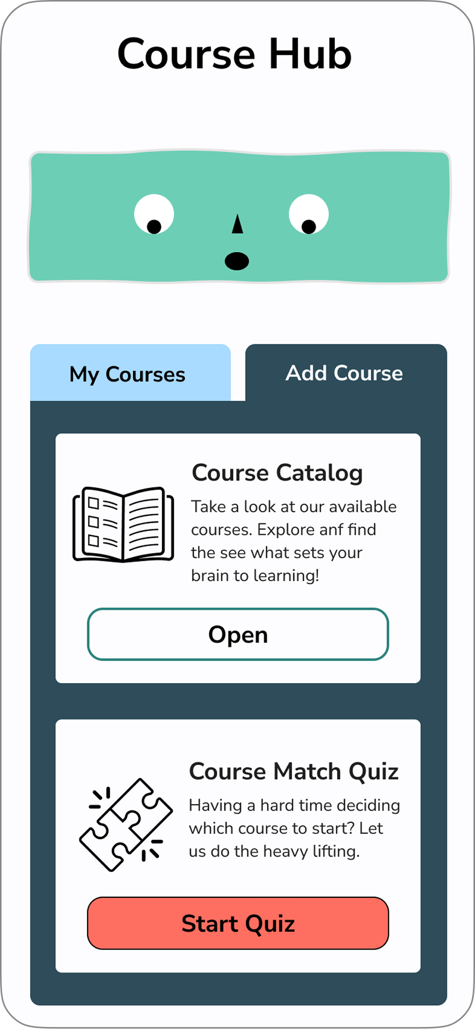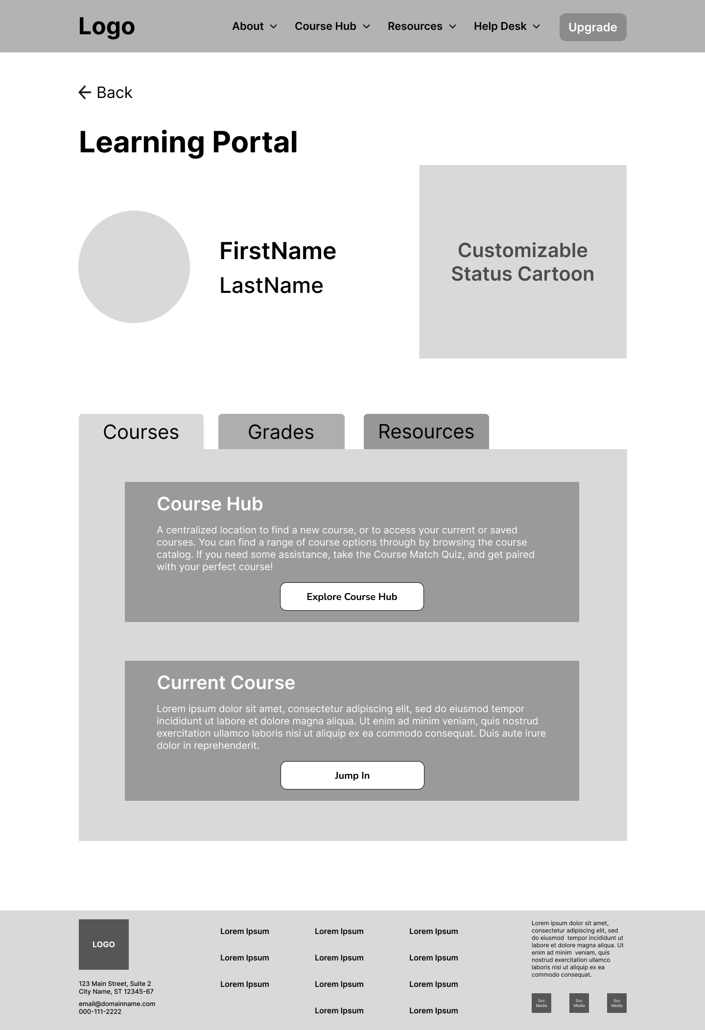 The site map nudges users along an initial path to ensure an account is made, while providing a transparent overview of product information (about, pricing, FAQ) on the home page. Users can then explore the two main focal points of the site: the Learning Portal and the Course Hub. The Learning Portal allows for learners to have a centralized location for check on their educational journey, and find resources for their continued success. The Course Hub is their gateway to knowledge. Learners can peruse the course catalog, or find customized results through the Course Match Quiz.