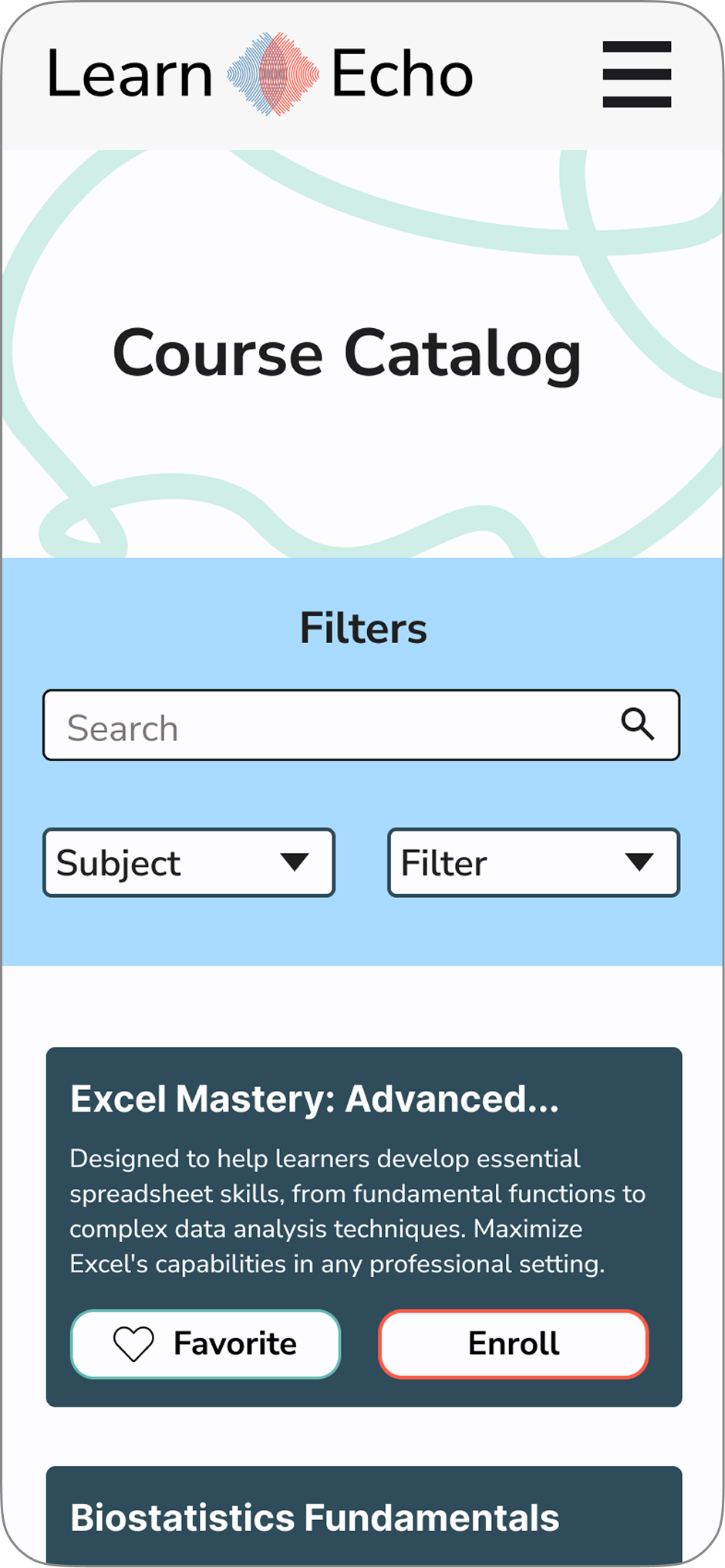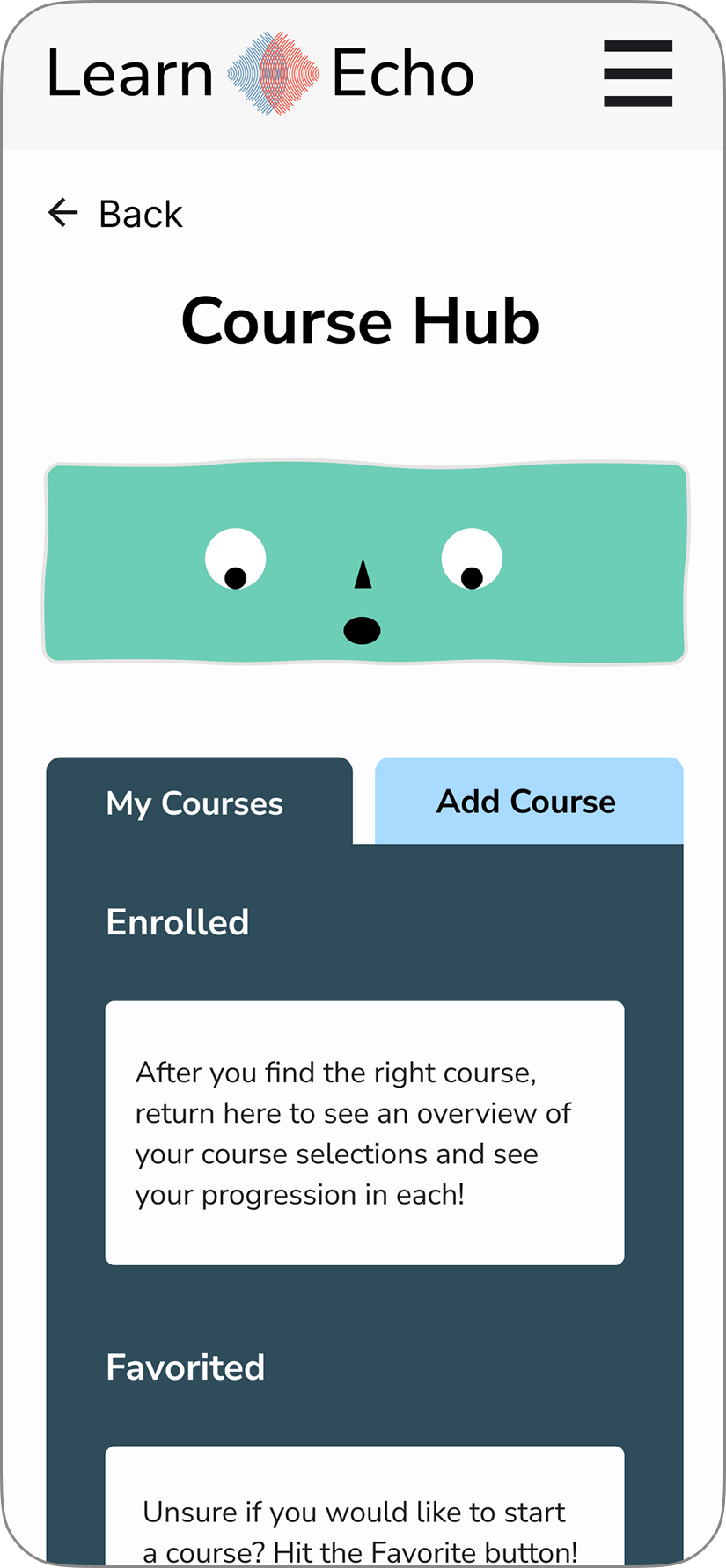 Previous iterations did not account for where Favorited items would appear. I opted to have them appear under My Courses. Creating a familiar tone, and having it on the initial tab of the Course Hub screen will make the users likely to reengage with the Favorited courses and enroll.