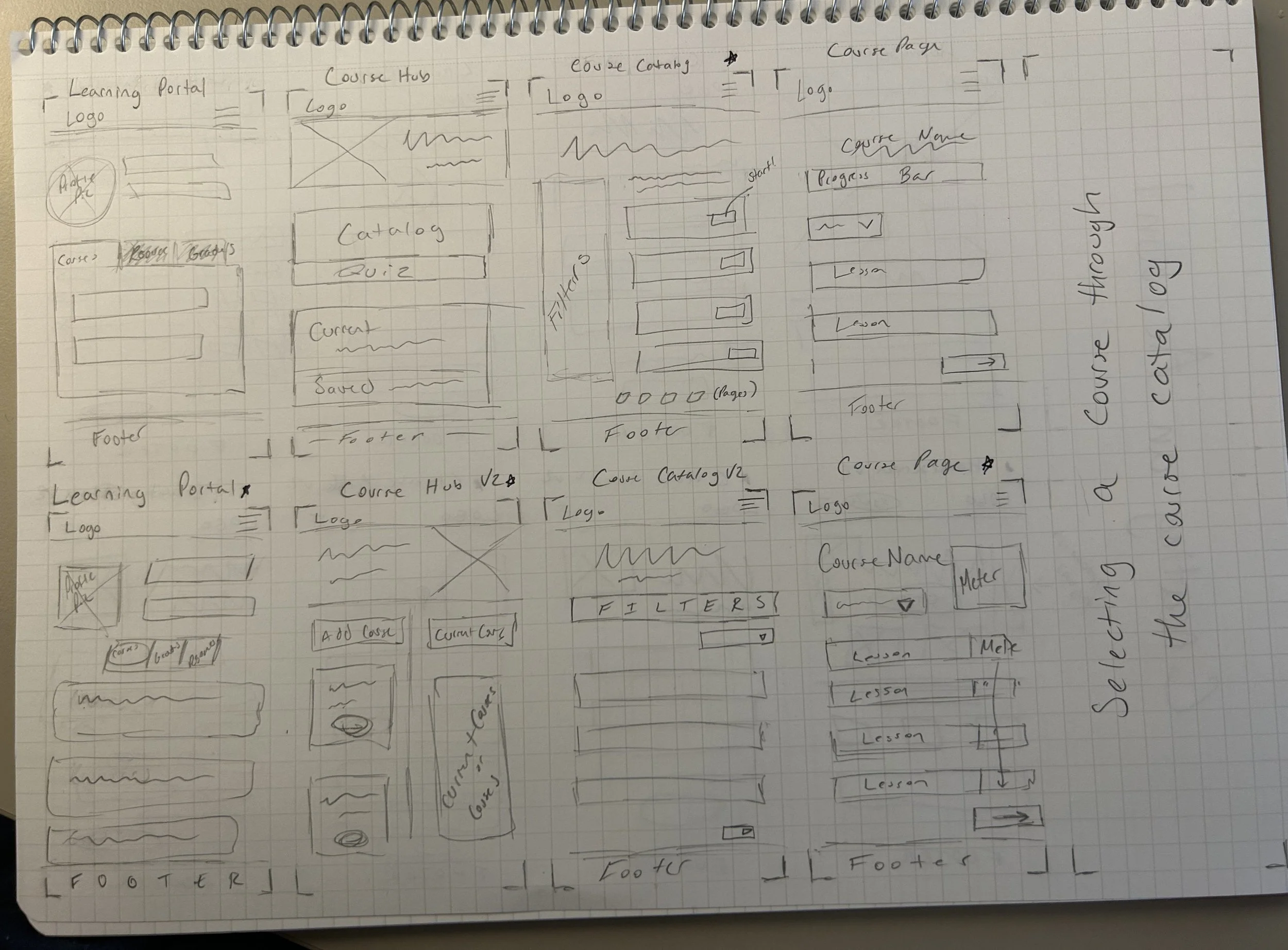 Based on initial feedback, I then proceeded with mid-fidelity wireframes, which allowed users to interact with the prototype, allowing more thorough feedback. I interviewed three individuals and gave them the task of starting Lesson 1, beginning from the Learning Portal screen. All were able to successfully navigate to the lesson without intervention, and their was generally positive feedback. Multiple users commented that they enjoyed the use of tabs, instead of needing to navigate to a new window. However, there was instances of slight friction when users interacted with the Course Catalog, mainly around functionality of the filters. Users were unsure how they could navigate to a specific class without a search feature. One user requested a search bar, as they felt that 4 filters was overwhelming.